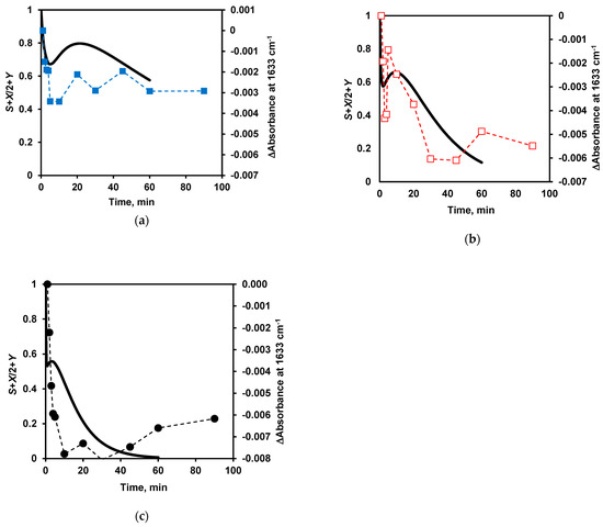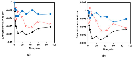 The intensity changes obtained from the FTIR-difference spectra (from Figure 4) with the S0/E0 ratios of 500 (●, black), 4000 (□, red), and 10,000 (■, blue) as a function of time during proteolysis reaction. The content of (a) β-sheets absorbing at 1633 cm−1, (b) α-helix absorbing at 1650 cm−1, and (c) antisymmetric stretching of free carboxylates (proteolysis products) absorbing at 1593 cm−1.