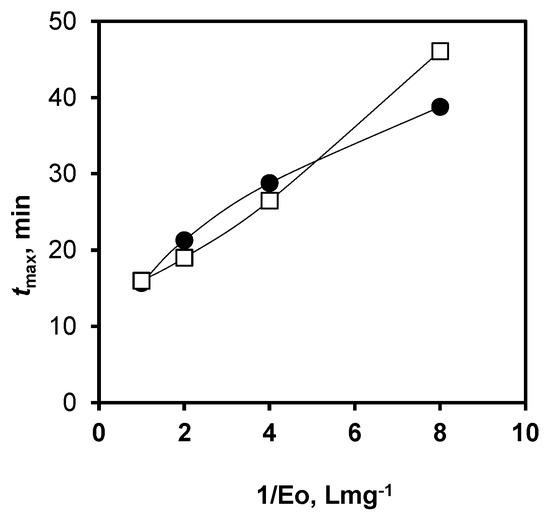 The value of the rate constant k1 was taken from the determination of the hydrolysis rate at the beginning of hydrolysis [24], so k1E0 = 0.0066 s−1 for E0 = 0.25 mg/L. The rate constant k3 was estimated formerly from the fluorescence and light-scattering data at long hydrolysis times [24]. From these data, k3E0 was taken to be 0.0002 s−1 for E0 = 0.25 mg/L. The experimental values of tmax for E0 = 1, 0.5, 0.25, and 0.125 mg/L were used [24]. The fitted value of the rate constant k2 = 0.0015 s−1 was used to calculate the theoretical dependence of tmax on 1/E0, which follows from the transcendental Equation (3). The similarity between the experimental and calculated values of tmax is shown in Figure 7.