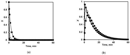 The obtained values of the rate constants k1, k2, and k3 were used to calculate the changes of the concentrations S(t), X(t), Y(t), and N(t) during proteolysis (Figure 8). The dependences calculated with Equation (2) for Y(t) at different S0/E0 ratios (Figure 8c) were close to those obtained by static light scattering for the proteolysis of β-CN at different trypsin concentrations (Figure 1 in [24]). One of these experimental curves for E0 = 0.25 mg/L is shown in Figure 8c. X(t) and Y(t) describe changes in the concentrations of intermediate products, which are first accumulated and then decayed. S(t) decreases from the beginning of the reaction, while N(t) grows with some delay in time (lag phase). The larger the S0/E0 parameter, the larger are tmax and the lag value (Figure 8).