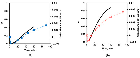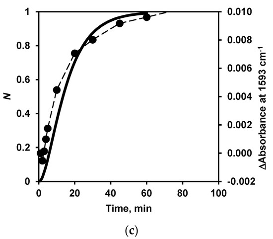 The dependences N(t) were close to the dependences describing the growth of free carboxylate groups measured at 1593 cm−1 (Figure 9). At low trypsin concentration, hydrolysis products were formed with a lag phase, which was predicted in the proteolysis reactions theoretically [39] and observed experimentally by FTIR spectroscopy in the current study (Figure 9).