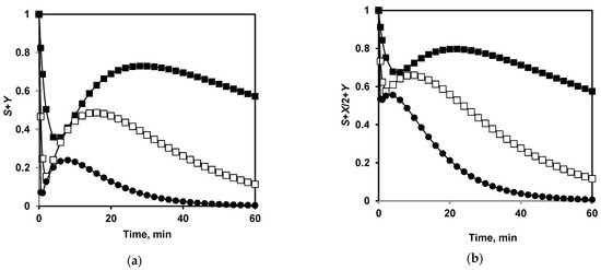 The local maximum of the function S+X/2+Y (Figure 11) shifts towards shorter times as the S0/E0 ratio decreases, so that at the highest enzyme concentration (S0/E0 = 500) it becomes poorly distinguishable. This pattern is observed in the experimental dependences for both β-sheets and α-helices (Figure 5a,b).