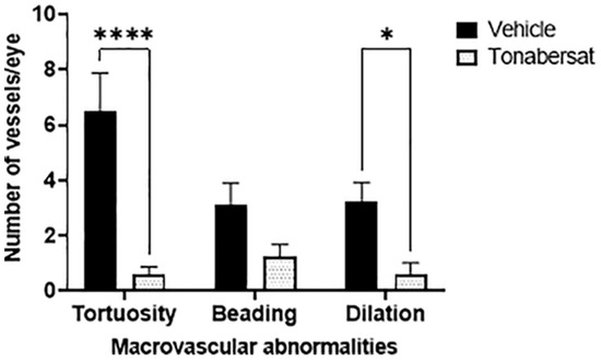 The results from the fundus images showed that the incidence α (Figure 1, Table 1), not the severity (Supplementary Figure S4), of macrovascular abnormalities (vessel tortuosity, beading, and dilation) was affected by intravitreal pro-inflammatory cytokines and the tonabersat treatment. The results showed that tonabersat reduced the number of eyes with vessel dilation, beading, and tortuosity relative to the vehicle group (p < 0.0001 for all). Furthermore, relative to the vehicle group, tonabersat reduced the average number of tortuous vessels per eye (0.58 ± 1.00 vs. 6.50 ± 1.39, p < 0.0001) as well as the number of dilated vessels per eye (0.58 ± 1.51 vs. 3.25 ± 0.67, p = 0.0183). Although the tonabersat treatment (1.25 ± 0.42) appeared to reduce the average number of beaded vessels per eye relative to the vehicle group (3.13 ± 0.77), statistical significance was not reached (p = 0.1423).