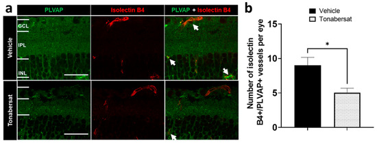 The retinal vessel integrity was determined by co-labelling mouse retina sections with PLVAP and Isolectin B4 (Figure 3a). The results showed that the tonabersat treatment (5.06 ± 0.64; p = 0.0417) decreased the number of PLVAP+ vessels relative to the vehicle group (9.00 ± 1.17) (Figure 3b).