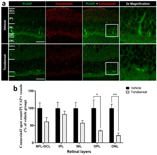 (a) Immunohistochemical images showing an example of PLVAP (green) and connexin43 (red) co-labelling. (b) Tonabersat treatment decreased the number of connexin43 spots on PLVAP+ vessels within the OPL and ONL but not the NFL-GCL, IPL, and INL. Data are presented as a mean + SEM. Statistical analyses were carried out using two-way ANOVA with Sidak’s multiple comparison’s test. * p ≤ 0.05, ** p ≤ 0.01. Scale bar = 50 µm. n = 8–12 eyes per group.