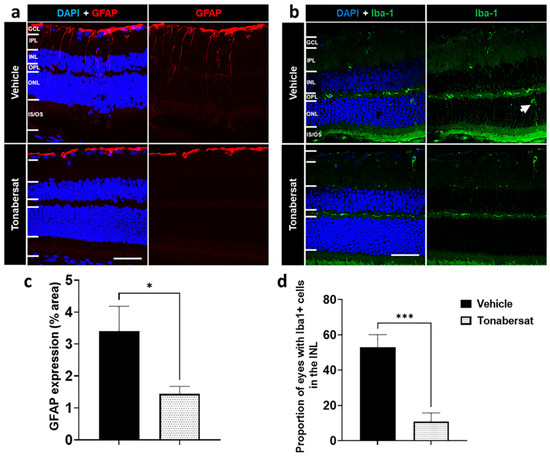 Immunohistochemical images showing (a) GFAP and (b) Iba-1 in vehicle and tonabersat-treated groups. (a) GFAP expression was restricted to the GCL in the tonabersat group but spanned from the GCL to the ONL in the vehicle group. (b) Vehicle alone led to migration of Iba-1+ cells into the ONL while tonabersat treatment restricted Iba-1+ cells to the IPL and OPL. The arrow indicates an Iba1 positive cell (activated microglia cell). Tonabersat treatment significantly decreased (c) overall GFAP levels and (d) the proportion of eyes with Iba-1+ cells in the INL. NFL = nerve fibre layer; GCL = ganglion cell layer; IPL = inner plexiform layer; INL = inner nuclear layer; OPL = outer plexiform layer; ONL = outer nuclear layer. Data are presented as a mean + SEM. Statistical analyses were carried out using a Student’s t-test. * p ≤ 0.05, *** p ≤ 0.001. Scale bar = 50 µm. n = 812 eyes per group.