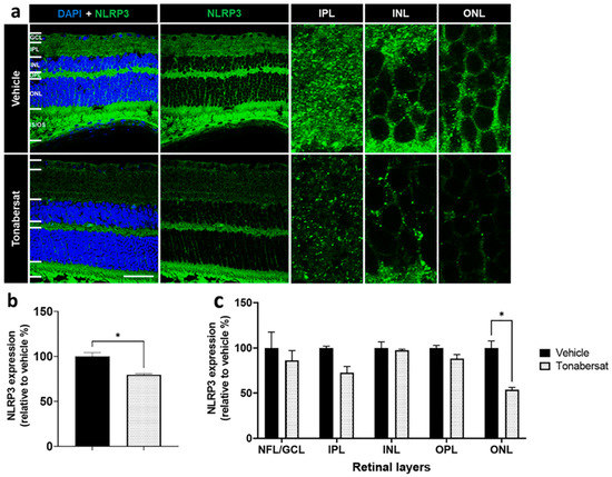(a) NLRP3 expression was evident in both groups though overall levels appeared lower following tonabersat treatment compared to the vehicle group. GCL = ganglion cell layer; IPL = inner plexiform layer; INL = inner nuclear layer; OPL = outer plexiform layer; ONL = outer nuclear layer; IS/OS = inner and outer segments. Scale bar = 50 µm. (b) Tonabersat treatment significantly decreased overall NLRP3 levels relative to the vehicle group. Statistical analyses were carried out using a Student’s t-test. (c) Quantification of NLRP3 spots indicative of inflammasome complex assembly within specific retinal layers suggests that tonabersat reduced the number of NLRP3 spots significantly only in the ONL. Data are presented as a mean + SEM. Statistical analyses were carried out using two-way ANOVA with Sidak’s multiple comparison’s test. * p ≤ 0.05. n = 8–12 eyes per group.