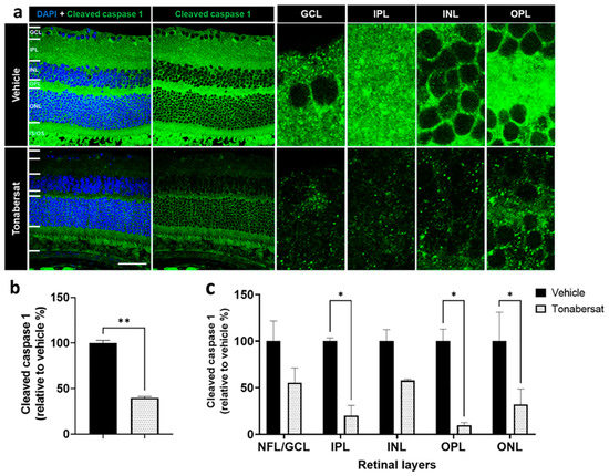The tonabersat treatment (39.64 ± 1.20%, p = 0.0028) also decreased the number of cleaved caspase-1 spots, another marker of inflammasome complex assembly, within the retina compared to the vehicle group (100.00 ± 2.31%), especially within the IPL (20.09 ± 8.92% vs. 100.00 ± 2.86%, p = 0.0305), OPL (9.57 ± 2.43% vs. 100.00 ± 10.46%, p = 0.0137) and ONL (31.94 ± 16.67% vs. 100.00 ± 25.33%, p = 0.0457) (Figure 7b,c). There was a non-significant trend towards lower levels of cleaved caspase-1 within the NFL-GCL (p = 0.2838) and INL (p = 0.4273) with the tonabersat treatment.
