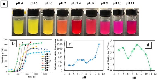 Figure 1a–d presents the change in turbidity of collagen solutions with pH 4 to 10 over time at 37 °C. No change in turbidity was detected for systems of pH 3 and 12 (i.e., no gelation). All other systems exhibited an induction time of fibrillization (i.e., lag phase [19,39]), a period in which there was no change in turbidity. This was followed by a rapid increase in turbidity, which can be attributed to the advancement in fibrillization (Figure 1b). The final turbidity values after the rapid increase are arbitrary, especially since the solutions exhibited different colors at various pH (Figure 1a) that may also affect light transmission, which is a key factor in this analysis [11,19,39,40,41].
