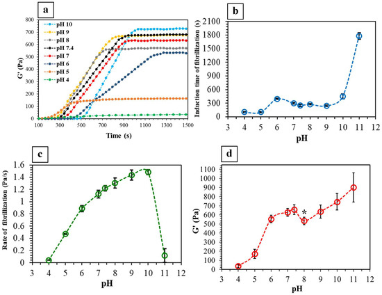 Figure 2b presents the induction time of fibrillization as a function of collagen solution pH. Similar to the turbidity measurements (Figure 1c), there was a significant delay in the fibrillization of the pH 11 solution. On the other hand, the rate of fibrillization increased up to pH 10 and then significantly decreased at pH 11 (Figure 2c). It has been discussed that the rate of fibrillization is mainly controlled by electrostatic interactions, which are affected by pH as a result of altering the net electrostatic charge of the fibrils [8,39,42].