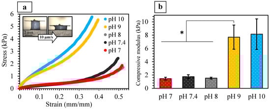 Mechanical properties of GAE-densified collagen gels: (a) Micro-compression stress-strain curves, and (b) compressive modulus of GAE-densified collagen gels of various pH (* p < 0.05; n = 7). Specimens were positioned such that their aspiration direction was parallel to the direction of the applied force.