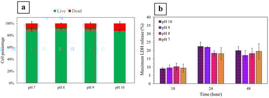 Cell viability assessment of various systems post densification, bioprinting, or injection is an essential characterization step in the biofabrication process [24,58]. In the current study, in order to investigate cellular responses to various environments characterized by different pH, NIH/3T3 fibroblasts were seeded in HHC gels at pH 7, 8, 9, and 10, which were then densified through GAE. Cells were extracted from the gels after 48 h and as shown in Figure 5a, the percentages of viable and dead cells were similar in all systems, demonstrating >80% viability. Although the mean value of viable cells appeared slightly lower at pH 10, this difference was not significant (p > 0.05) suggesting that cell viability was not impacted when gels were cast in precursors of different pH followed by densification via GAE. These results are consistent with those generated from cellular LDH release when seeded in gels at pH 7, 8, 9, and 10 (Figure 5b). No difference between the maximum LDH release of cells seeded in the systems of various pH was observed up to 48 h, thus further confirming that the pH of the HHC precursors did not affect cell survival.