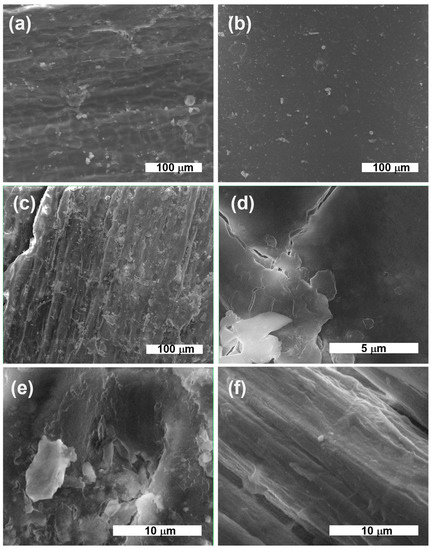 After deposition, the HMP-STK target and the thin film deposited on glass slab were analyzed with electron microscopy (SEM) and the images are presented in Figure 1a,b. It can be observed that a continuous thin film was obtained consisting of droplets or agglomerations. Agglomerations can be also observed in the SEM images of the HMP-STLK (Figure 1a,c,e) and on the surface of the PLD-HMP-STK/HMP-FB sample (Figure 1f). The red-brownish color of the material of the PLD-HMP-STK thin films is observed in the optical microscopic images in Figure 2c,d. In Figure 1c, the transparency of the PLD-HMP-STK/Glass thin film can be noticed, as well as opaque, whitish formations that look like splashes. Their appearance corresponds to similar formations in the hemp stalk in the optical microscopic images of Figure 2a,b. The SEM images obtained two years after deposition of the thin films exhibit cracks in the PLD-HMP-STK/Glass due to multiple manipulations and the scratching procedure for FTIR analysis. However, we consider that the thin layer has a good mechanical strength and adhesion to the glass substrate. The elemental composition of the PLD-HMP-STK on glass and on HMP-FB is similar to the target elemental composition and presents inhomogeneities for different areas when analyzed by EDX. An increase in calcium and magnesium concentration can be observed from an average of 1.5% calcium and 0.2% magnesium in the HMP-STK target to an average of 2.2% calcium and 1.2% magnesium in the PLD-HMP-STK thin films, while carbon content decreased from an average of 66% in HMP-STK target to 50% or less in the PLD-HMP-STK thin films. Due to the inhomogeneous disposition of the constituents, a conclusion cannot be drawn in this regard.