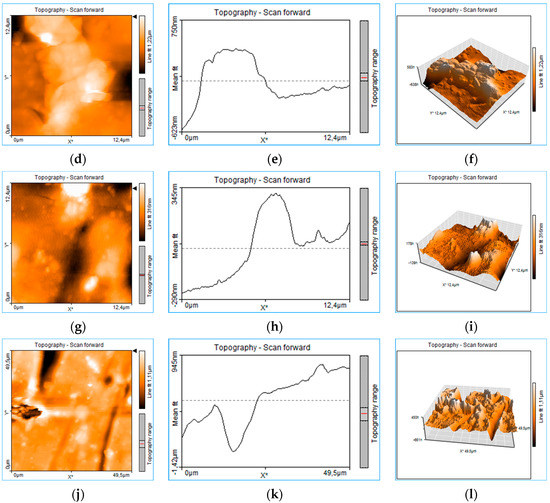 The rough structure of the thin layer deposited on the glass (PLD-HMP-STK/Glass) of an unevenly distributed topography can be seen in Figure 3. Craters of 151 nm and 290 nm are noticed in the 1D topography plots on thin film thickness in Figure 3b,e. Aggregated structures and droplets of different sizes from 100 nm to 1.5 μm or even 6 μm are noticed in the 2D images of topography (Figure 3a,d,g,j). In Figure 3, the 1D plots (e) and (h) of the thin film topography show two structures assigned to droplets. The measurements of size droplets were performed on the x-axis as FWHM (full width at half maximum) and on the z-axis. The droplets’ widths were 4.78 μm and 2.610 μm, respectively, while the droplets’ heights were 357 nm and 98 nm. The topographic lines (Figure 3b,e,h,k) also indicate overlapping or clumped droplets by the jagged appearance of the lines [21], this indicates that most of the micrometric structures are in fact the result of nanostructure aggregation. The roughness is well observed in the 3D plots (Figure 3c,f,i,l). The AFM images were acquired after various manipulation including collecting material from the PLD-HMP-STK thin film for the FTIR analysis. Therefore, the “channels” of 623 nm to 1.42 μm depth observed in the plots of Figure 3g–l are due to cracking or they resulted during scratching for the sample collecting purpose.