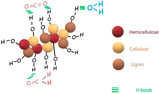 The adsorbed formaldehyde exhibited by the vibrations at 1554 cm−1 and 1747 cm−1 in HMP-STK and PLD-HMP-STK and which are missing in HMP-FB denote good adsorbing properties of the PLD-HMP-STK material. Adsorbed water and adsorbed carbon dioxide are also evidenced in the HMP-STK and PLD-HMP-STK spectra denoted by the peaks at 3938 cm−1, 3848 cm−1, and mainly by the peak at 1639 cm−1 for water and the peak at 2462 cm−1. These peaks are missing in the HMP-FB spectrum. These adsorbing properties are due to an effective microporous structure that can be noticed in the AFM images of the thin film of PLD-HMP-STK topography (Figure 3). Additionally, the free O-H phenolic and alcoholic groups in lignin and cellulose, respectively, indicated by the vibrations at 3938 cm−1 and 3848 cm−1, are available to H-bonding with the C=O groups in CO2 and in formaldehyde and with the O-H groups in water, as schematically represented in Figure 5.