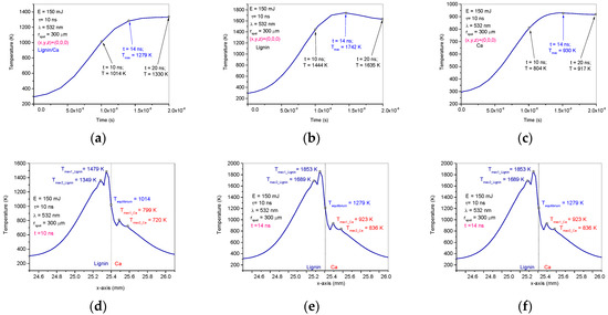 Pulsed laser heating effects on the lignin/Ca composite: Temperature diagrams in time on the spot center of the lignin/Ca composite target (a), of the calcium target (b) and of the lignin target (c); in pulse width on the lignin/Ca composite target (10 ns) (d), 14 ns after pulse laser ignition on the lignin/Ca composite target (e) and 20 ns after pulse laser ignition on the lignin/Ca composite target (f).