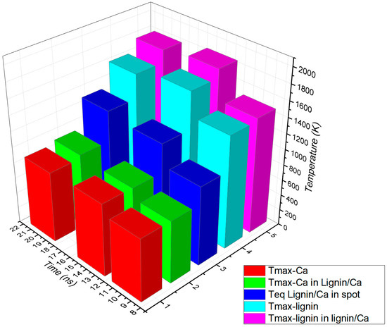 In order to evaluate the results of the simulation, the maximum temperatures in the individual targets of Ca and lignin and of each calcium and lignin component in the lignin/Ca composite as well as the temperatures of equilibrium were centralized in Table 2 based on the times when they were achieved. The data in Table 2 were plotted as shown in Figure 7. Compiling the optical and thermal parameters of the materials, the simulation shows enhancements of thermal effects in the lignin/Ca composite for both components (Tmax-Ca in lignin/Ca and Tmax-lignin in lignin/Ca) compared to the values achieved on the individual targets (Tmax-Ca and Tmax-lignin). Lignin better absorbs laser irradiation than calcium and laser heating is more effective on the component (Tmax-lignin in lignin/Ca) in the composite target. The maximum temperature of the component (Tmax-Ca in lignin/Ca) is considered the equilibrium temperature (Teq lignin/Ca in spot) achieved in the center of the spot due to laser heating and the thermal diffusion effect.