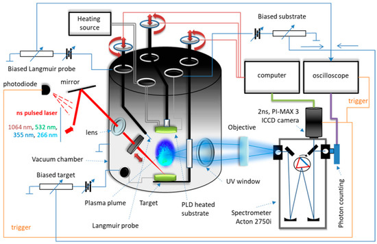 The Laser-Induced Fluorescence (LIF) spectroscopy was performed using the 355 nm wavelength beam of the YG 981E/IR-10 laser system: Quantel-YG980 Q-switched Nd:YAG laser, Quantel, Les Ulis, France [27,29]. Both samples of thin films (PLD-HMP-STK/Glass and PLD-HMP-STK/HMP-FB) were used in LIF analysis.