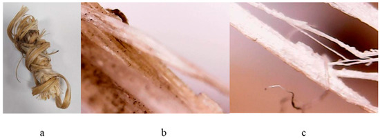 The test was designed to obtain thin films by pulsed laser deposition (PLD), which involves controlled atmosphere laser ablation. Small bundles, as shown in Figure 10, were made from crushed stalk (simulating “decortication process”). The bundles resulted from the crushed hemp stalk (HMP-STK) were irradiated and the effects were studied while the method was improved until thin films were deposited on the glass slab (PLD-HMP-STK/Glass—Figure 2b) and on the hemp fabric (PLD-HMP-STK/HMP-FB—Figure 2c).
