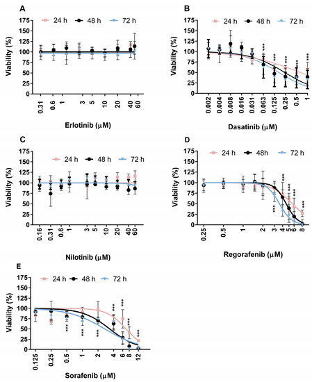 The viability of ZFL cells after 24, 48, and 72 h of exposure to TKIs was determined using the tetrazolium-based (MTS) assay (Cell Titer 96 AQueous Non-Radioactive Cell Proliferation Assay; Promega, Madison, WI, USA) as previously described by Novak et al. [83]. Cells were seeded in 96-well microtiter plates (Corning Costar Corporation, New York, NY, USA) at a density of 7000 cells/well. After 24 h, the growth medium was replaced with fresh growth medium containing TKI at the following concentrations: dasatinib (0.002–1 μM), erlotinib (0.300–50 μM), nilotinib (0.156–60 μM), regorafenib (0.250–8 μM), and sorafenib (0.125–1 μM). Three independent experiments were performed, each with five replicates per treatment point. The statistical significance between the treated groups and the solvent control was determined by Student’s t-test using GraphPad Prism V6 (GraphPad Software, La Jolla, CA, USA). *** (p < 0.001)was considered statistically significant.