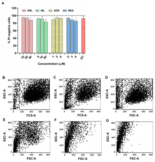 Effect of erlotinib (ERL), nilotinib (NIL), regorafenib (REG), and sorafenib (SOR) on zebrafish liver cell (ZFL) viability. (A) Viability of ZFL after 72 h exposure was determined using propidium iodide staining (PI) to distinguish between live and dead cells using flow cytometry. ET (0.17 μM) was used as a positive control. (B) Forward side scatter and side scatter (FSC/SSC) dot plots representing the distribution of ZFL cells after exposure to (B) control medium, (C) 0.17 μM etoposide, (D) 50 μM benzo[a]pirene, (E) 0.015 μM DAS, (F) 0.03 μM DAS, (G) 0.06 μM DAS. Three independent experiments were performed. * (p < 0.05).