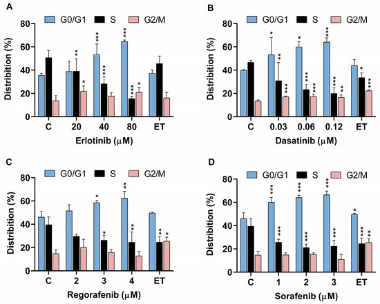 Flow cytometric analysis of cell cycle distribution of zebrafish liver cells (ZFL) after exposure to (A) erlotinib, (B) dasatinib, (C) regorafenib, (D) sorafenib for 72 h. ET (0.17 μM) was used as a positive control. Three independent experiments were performed. Significant difference between untreated control cells (C) and cells exposed to TKIs and ET. * (p < 0.05), ** (p < 0.01), *** (p < 0.001).