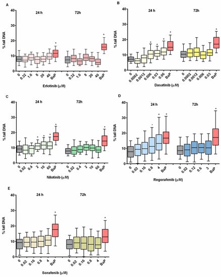 DNA damage evaluation in TKI-exposed ZFL cells. Cells were exposed to (A) erlotinib, (B) dasatinib, (C) nilotinib, (D) regorafenib, (E) sorafenib for 24 and 72 h. DNA damage was assessed by the comet assay and is expressed as percentage (%) of DNA in the comet tail. Fifty nuclei were measured per experimental point and are presented in box-plots. Three independent experiments were performed. B(a)P (benzo[a]pirene 50 µM) was used as positive control. * (p < 0.05).