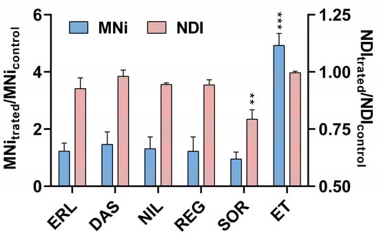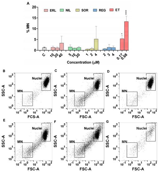 ZFL cells were seeded onto 24-well culture plates (Nunclon) at a density of 35,000 cells per well for 24 h. Cells were then treated with erlotinib (10, 20, and 40 μM), sorafenib (1, 2, and 4 μM), regorafenib (2, 3, and 4 μM), dasatinib (0.015, 0.03, and 0.06 μM), and nilotinib (5, 10, and 20 μM). Etoposide (0.17 μM and 0.68 μM) was used as a positive control. After 72 h, cells were placed on ice for 20 min, and subsequently a 0.05 mg/mL EMA solution was added to each well. The cells were placed on ice for 30 min and exposed to light for photoactivation of the EMA fluorochrome. Afterwards, cells were washed and resuspended in lysis solution (0.584 mg/mL NaCl, 1 mg/mL sodium citrate, and 0.3 μL/mL Triton X-100) containing 0.2 μM SYTOX Green and 0.25 mg/mL RNAse A, and incubated for 1 h in the dark at 37 °C. After incubation, lysis solution (85.6 mg/mL sucrose and 15 mg/mL citric acid) containing 0.2 μM SYTOX Green was added to the wells of the plate and incubated for a further 30 min at room temperature in the dark. Cells were analyzed on the same day using MACSQuant Analyzer 10 flow cytometer. MASCQuantify Software 2.11. was used to analyze each sample, and the percentage of micronuclei was determined after the acquisition of a total of 20,000 gated nuclei events, excluding EMA-positive events. One-way ANOVA with post hoc multiple comparison Dunett’s test using GraphPad Prism V6 (GraphPad Software, Carlsbad, CA, USA) was carried out. * p < 0.05 and *** p < 0.0001 were considered statistically significant.