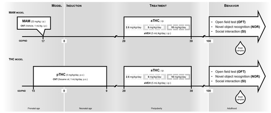 Timeline and experimental design used to investigate the effects of peripubertal THC (aTHC) exposure in two neurodevelopmental models of psychopathology. MAM model: pregnant rats were intraperitoneally (i.p.) treated with methylazoxymethanol (MAM) acetate (22 mg/kg) or saline (CNT: 1 mL/kg) on gestational day (GD) 17. From postnatal day (PND) 19 to PND 39, resulting male offspring were i.p. treated twice/day with increasing doses of THC (aTHC) or respective vehicle (aVEH). Behavioral tests (open field test, novel object recognition test and social interaction test) were conducted in adulthood from PND 100. After completion, the neurochemical analyses (quantitative real-time PCR and DNA methylation by pyrosequencing) were performed in the prefrontal cortex of rats. THC model: Pregnant rats were treated with THC (pTHC, 5 mg/kg/day; per os) or vehicle (CNT; 1 mL/kg/day; per os) from gestational day (GD) 15 to postnatal day (PND) 9. From PND 19 to PND 39, the resulting male offspring were i.p. treated twice/day with increasing doses of THC (aTHC) or respective vehicle (aVEH). Behavioral tests (open field test, novel object recognition test and social interaction test) were conducted in adulthood from PND 100. After completion, the neurochemical analyses (quantitative real-time PCR and DNA methylation by pyrosequencing) were performed in the prefrontal cortex of rats.