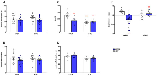 Effects of peripubertal treatment with THC (aTHC) on the behavioral phenotype of prenatally MAM-exposed rats in the open field test ((A): number of crossings; (B): number of rearings), in the social interaction test ((C): time of interaction; (D): number of interactions) and in the novel object recognition test ((E): discrimination index) in adulthood. Data are presented as means ± S.E.M. (n = 5–14 rats/group). ** p < 0.01 and *** p < 0.001 vs. CNT/aVEH; ## p < 0.01 vs. MAM/aVEH, Tukey’s post hoc test.