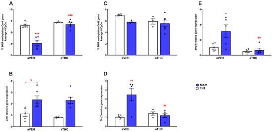 Effects of peripubertal treatment with THC (aTHC) on cannabinoid CB1 (Cnr1), dopamine D2 (Drd2) and D3 (Drd3) receptor genes in the prefrontal cortex of prenatally MAM-exposed rats in adulthood. Data are presented as means ± S.E.M. (n = 3–6 rats/group) of (A) DNA methylation of Cnr1 gene (average 4 CpG sites), (B) Cnr1 mRNA expression, (C) DNA methylation of Drd2 gene (average 6 CpG sites), (D) Drd2 mRNA expression and (E) Drd3 mRNA expression. * p < 0.05, ** p < 0.01 and *** p < 0.001 vs. CNT/aVEH; ## p < 0.01 and ### p < 0.001 vs. MAM/aVEH, Tukey’s post hoc test; $ p < 0.05, unpaired-t test.