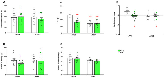 Effects of peripubertal treatment with THC (aTHC) on the behavioral phenotype of perinatally THC-exposed (pTHC) rats in the open field test ((A): number of crossings; (B): number of rearings), in the social interaction test ((C): time of interaction; (D): number of interactions) and in the novel object recognition test ((E): discrimination index) in adulthood. Data are presented as means ± S.E.M. (n = 5–13 rats/group). * p < 0.05 and *** p < 0.001 vs. CNT/aVEH, Tukey’s post hoc test.