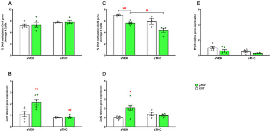 The effect of aTHC exposure alone or combined with pTHC on mRNA expression of dopamine D2 receptors in PFC is depicted in Figure 5D. Two-way ANOVA revealed a significant pTHC × aTHC interaction [F(1,16) = 6.606, p = 0.0205], but neither a main effect of pTHC [F(1,16) = 3.848, p = 0.0674] nor a main effect of aTHC [F(1,16) = 0.8581, p = 0.3680]. Post hoc analysis revealed that pTHC exposure increased the dopamine D2 mRNA expression (p < 0.05 vs. CNT/aVEH), which was not significantly modified by aTHC (p > 0.05 vs. pTHC/aVEH). Furthermore, in the CNT group, aTHC did not significantly affect the D2 mRNA expression (p > 0.05 vs. CNT/aVEH). The pTHC exposure reduced the DNA methylation of the D2 (Drd2) gene regulatory region in the average of the six CpG sites investigated in the PFC of adult rats (p < 0.001 vs. CNT/aVEH, t-test), which was further reduced by aTHC (p < 0.01 vs. pTHC/aVEH, t-test). In the CNT group, aTHC did not significantly affect the DNA methylation of the D2 (Drd2) gene regulatory region [p > 0.05 vs. CNT/aVEH; two-way ANOVA, pTHC effect: F(1,13) = 28.09, p = 0.0001; aTHC effect: F(1,13) = 18.05, p = 0.0009; and pTHC × aTHC interaction: F(1,13) = 0.09454, p = 0.7634; Figure 5C). pTHC alone or combined with aTHC exposure failed to affect the mRNA expression of dopamine D3 receptor in the PFC of adult rats [two-way ANOVA, pTHC effect: F(1,16) = 4.268, p = 0.0554; aTHC effect: F(1,16) = 7.086, p = 0.0170; and pTHC × aTHC interaction: F(1,16) = 0.3213, p = 0.5787; Figure 5E].