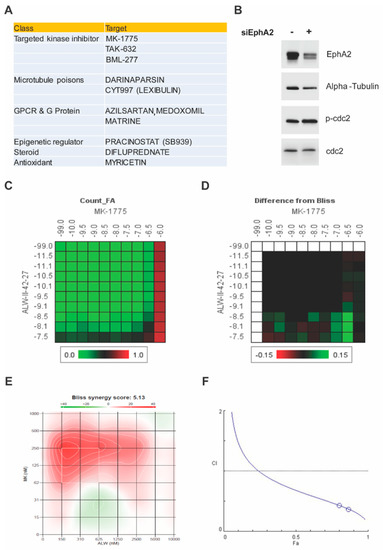 Given the oncogenic function of EphA2 in endometrial cancer, we performed a systematic high-throughput drug screen on an endometrial cancer cell line (Hec1A) transfected with either control siRNA or EphA2 siRNA with two drug libraries containing a total of 1510 drugs comprising FDA-approved drugs, clinical candidates, active pharmaceutical ingredients, and chemotherapeutic agents. We hypothesized that candidate small molecule drugs from these libraries would overcome resistance to anti-EphA2 therapeutics such as EPHARNA and thereby enhance their therapeutic benefit when given as combined therapy. Among the top hits, the biggest class represented was targeted kinase inhibitors (MK-1775, TAK-632, and BML-277), followed by microtubule poisons (darinaparsin and CYT997) and GPCR and G protein inhibitors (azilsartan, medoxomil, and matrine) (Figure 1A). Among the three kinase inhibitors in the hit list, the Wee1 inhibitor, MK1775, demonstrated the greatest synergistic interaction score (Bliss synergy score of 1.14) when combined with the EphA2 inhibitor, ALW (Figure 1C,D). Furthermore, EphA2 knockdown increased Wee1 activity as evidenced by elevated phospho-cdc2 levels (Figure 1B), hinting that Wee1 activation may be a compensatory mechanism to adapt to the loss of EphA2 and maintain cell viability.