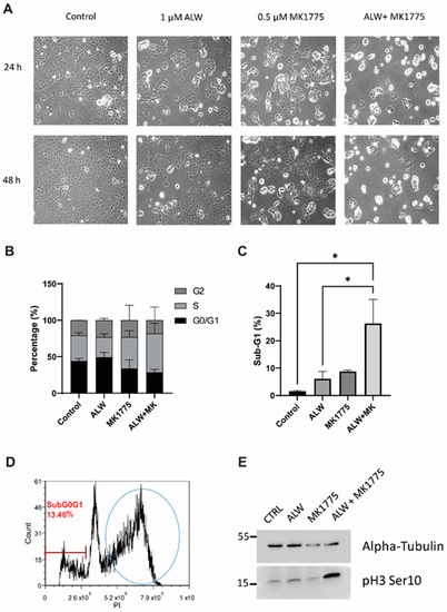 Effects of combination therapy on cell proliferation. (A) Cell morphology images of untreated (control) and ALW- and MK1775-treated Hec1A cells at 24 h and 48 h timepoints. (B,C) Flow cytometry analysis of cell cycle phases in Hec1A cells that were untreated or treated for 48 h. (D) Cell cycle profile of ALW- and MK1775-treated cells showing cells arrested between the S and G2 phases. (E) Western blot analysis for phosphorylated histone H3, an indicator of cells arrested in mitosis. Statistics were performed using one-way ANOVA with the Tukey’s post hoc test for multiple comparisons for more than two groups. * p < 0.05.