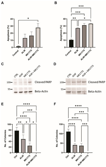 Apoptotic and clonogenic effects of combination therapy. (A,B) Flow cytometry analysis of apoptosis in Hec1A (A) and Ishikawa (B) cells that were untreated or treated with ALW, MK1775, or both drugs. (C,D) Expression of apoptosis marker cleaved PARP in untreated or drug-treated Hec1A (C) and Ishikawa (D) cells. (E,F) Clonogenic colony formation assay in untreated or drug-treated Hec1A (E) and Ishikawa (F) cells. Statistics were performed using one-way ANOVA with the Tukey’s post hoc test for multiple comparisons for more than two groups. ns, nonsignificant; * p < 0.05; ** p < 0.01; *** p < 0.001; **** p < 0.0001.