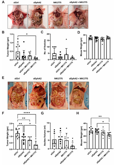 Female nude mice aged 4–8 weeks were purchased from Taconic Biosciences, USA. All mice were housed at The University of Texas MD Anderson Cancer Center animal facility under specific pathogen-free conditions. All animal-related experiments were approved by the Institutional Animal Care and Use Committee of MD Anderson Cancer Center. The right uterine horns of 8-week-old female athymic nude mice were injected with five million Hec1A cells in 100 µL of Hank’s Balanced Salt Solution (HyClone, Logan, UT, USA) to the uterine horn. For the second model, one million Ishikawa-Luc cells were injected into the peritoneal cavity of 6–8-week-old female mice. After eight days, mice were randomized to four groups (10 mice per group): siControl-DOPC nanoparticles (NPs), siEphA2-DOPC NPs, siControl-DOPC NPs with MK1775, and siEphA2-DOPC NPs with MK1775. The siRNA-DOPC NPs were given to mice twice a week intraperitoneally, and MK1775 (30 mg/kg) was administered daily by oral gavage. Once mice from any group became moribund, all mice were euthanized; mouse weight, tumor weight, ascites volume, and number of nodules were recorded.