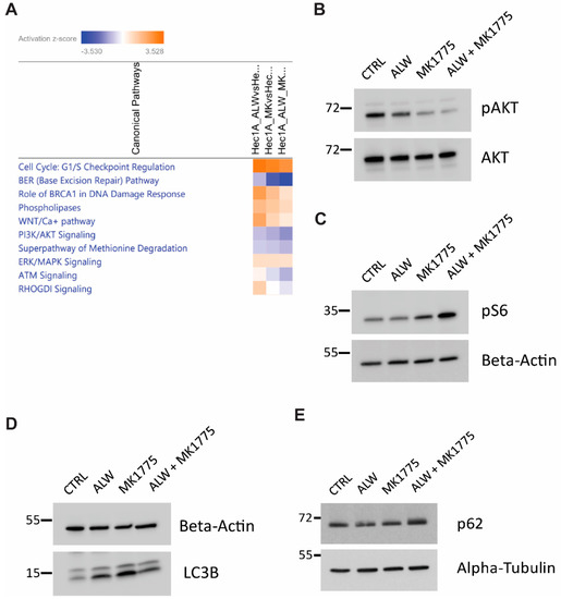 Hec1A cells were plated in six-well plates at a density of 100,000 cells per well, in triplicate, and incubated overnight. After 24 h, cells were treated with DMSO, 1 µM ALW, 0.5 µM MK1775, or the combination of 1 µM ALW and 0.5 µM MK1775 for 8 h, after which the RNA was extracted using Direct-zol RNA Miniprep Plus kit (ZYMO Research, Irvine, CA, USA). RNA quality was determined by RNA integrity number using a Bioanalyzer (Agilent Technologies, Santa Clara, CA, USA), and the samples were shipped to Novogene (Sacramento, CA, USA) for RNA-Seq analysis on the Illumina NovaSeq 6000 platform. Downstream analysis was performed using a combination of programs, including hisat2, DEseq2, and ClusterProfiler software. Pathway analysis was performed using Ingenuity Pathway Analysis (IPA) (Qiagen, Hilden, Germany).