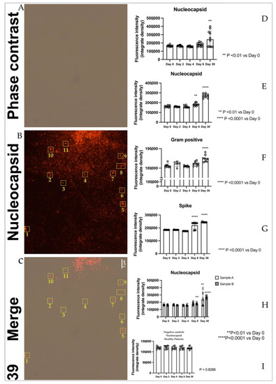 The immunofluorescence images (panel D Figure 1), obtained with antibodies against nucleocapsid proteins of SARS-CoV-2, present in bacterial cultures derived from stool samples, show the presence of nucleocapsid protein in samples A(1,2,…..10) (derived from stool samples of 10 sick individuals) increased significantly at day 30 compared to day 0. The protein showed a similar trend in samples B (1,2,…..10) (panel E Figure 1) (derived from stool samples of 10 healthy individuals contaminated with 10 supernatants of samples A), where it was raised both at day 6 and day 30, confirming our previous results [28]. Spike protein in samples A(1,2,…..10) (panel G Figure 1) showed a strong increase of signal at day 6 and day 30 in a similar manner as the nucleocapsid protein (panel E Figure 1). The signal of gram-positive protein (panel F Figure 1) on samples C(1,2,…..10) (derived from 10 pellets of samples) increased at day 30, confirming a proliferation of gram-positive bacteria in these samples. Quantitative analysis of nucleocapsid signal in bacteria cultures derived from stools of healthy patients confirms the absence of viral protein or at least a lower signal compared to B (A+) patients (Figure 1 panel I). We have identified, as presented in Figure 1, panels A, B, and C, strains of Dorea formicigenerans bacteria (DSM Numbers 3992) labeled with antibodies against nucleocapsid protein of SARS-CoV-2, while in figure panel C, a gram-positive bacterial culture from a SARS-CoV-2 positive individual is highlighted, after 30 days, enlarged and fluorescent to the nucleocapsid protein. In the yellow rectangle, numbered 1–11, Figure 1 panels B and C, bacteria Dorea formicigenerans strains are visible (DSM Numbers 3992) and immunofluorescence to antibodies against nucleocapsid proteins of SARS-CoV-2. Figure 2, panel A shows representative immunofluorescence of one sample among the ten samples A, B, and C of nucleocapsid (N), gram-positive, and spike proteins at 0, 2, 4, 6, and 30 days. Negative samples control neg-B (bacteria derived from the gut microbiome of healthy individuals, negative to molecular oropharyngeal swab test, (RT-PCR analysis, Viasure real-time PCR detection kit, Cortest Biotec), and molecular feces test, are shown in panel D of Figure 2, where antibodies versus gram-positive bacteria and nucleocapsid proteins were introduced in the samples—with no signals present in the samples of healthy controls (Figure 2, panel D, left side). The other negative control was also performed with only secondary antibodies, with the absence of immunofluorescence visible in panel D, Figure 2, seen on the right. All the cases are presented in supplementary materials in Figures S1 and S2.