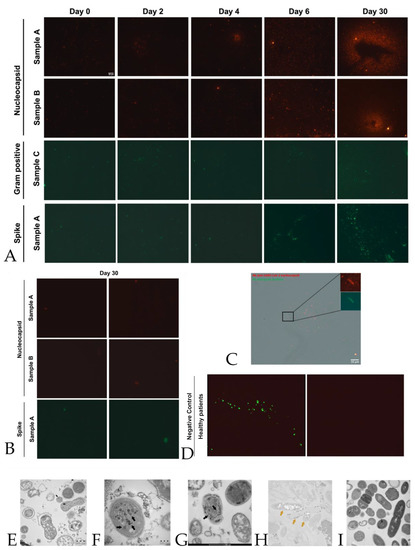 Quantification of SARS-CoV2 peptides by immunofluorescence. Panel A: Representative panels show immunofluorescence of one sample among the ten samples A, B, and C of nucleocapsid, gram-positive, and spike proteins at 0, 2, 4, 6, and 30 days. Scale bar, 10 μm. All the cases are presented in supplementary materials in Figures S1 and S2. Panel B: Negative control of immunofluorescence of samples A and B at day 30 for nucleocapsid and spike proteins. Samples were incubated only with a secondary antibody; subsequently, no protein signal was detected. Panel C: A gram-positive bacterial culture from a SARS-CoV-2 positive individual, after 30 days, enlarged and fluorescent to nucleocapsid protein. Scale bar, 10 μ. Panel D, left side: shows the negative control immunofluorescence of healthy individuals (negative on nasopharyngeal swab with real-time RT-PCR) with no detection of infected SARS-CoV-2 bacteria (control on proteomic analysis and Luminex assay), as described in Materials and Methods (Section 4). In particular, the merge of gram-positive bacteria (green) and no signal for nucleocapsid proteins (red background) is visible. Panel D, the right side, represents the same image as the left side but with only the red background shown. Panel E–G: Transmission electron microscope images (panels A and B, TEM FEI, Thermo Fisher Tecnai G2 operating at 120 kV) show SARS-CoV-2 (indicated by black arrows) inside a bacterium. The proteomic profile at mass spectrometry confirms the presence of an abundance of SARS-CoV-2 proteins, together with the Luminex assay test, in the cultures of bacteria under study. Panel H,I: Immunogold labeling technique at transmission electron microscope on the same samples with anti-nucleocapsid protein of SARS-CoV-2 antibody (golden arrows); the gold particles are inside the bacteria, and no presence in bacteria from healthy individuals (Panel I). See more details in Materials and Methods (Section 4).