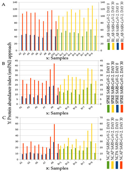 Spectral counting (Figure 3) is a semiquantitative mass spectrometry approach for defining the abundance of the molecules under study, and it was obtained using the exponentially modified protein abundance index (emPAI) approach: “Absolute amount determination without added standards is based on the assumption that proteins detected make up most of the protein content in the sample and unidentified proteins are at low abundance and have only minor effect on the total protein amount. This simplification has been used successfully for absolute protein expression (APEX), Total Protein Approach (TPA), and emPAI. Such simplification has resulted in good agreement with a spike in standard protein concentrations.” A recently published study has compared different label-free absolute quantification strategies and is an excellent reference point, where large-scale proteome quantification is made with or without standard proteins, referred to as the calibration curve model and the direct proportionality model, respectively [30]. Spectral counting was performed in every aliquot, considering the abundance of the SARS-CoV-2 peptide (Figure 3). The infected samples were compared with the samples control. The normalized value was obtained by using the formula (i): Nf = C * Stc(i)/Stc(c). Nf is the normalized value, weight C is a coefficient calculated on the basis of the false discovery rate, Stc(i) is the protein statistical counting coefficient obtained by analyzing the infected samples, and Stc(c) is the statistical counting coefficient obtained from the samples control.