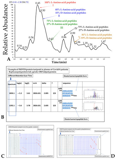 Diastereomeric peptides containing D-Amino acids (Figure 4) have been identified in all COVID-19 individuals and not in the healthy control using the multifragmentation pathway approach at different mass spectra retention times [40,41]. The enantiomeric peptide form has been resolved by means of liquid chromatography using a HOLO 50x2.1 2.7 µm (VWR, Milan, Italy) particle size column. The repeated peptide sequences exhibiting the fragmentation pathways identified by the database search approach at multiple retention times have been marked as enantiomeric formations containing D-Amino acid. D-structure was identified by specific fragmentation pathways [42]. Representative images of these observations are presented in Figure 4. Particular interest is the different retention scan times of the same peptides (rectangular violet in Figure 4 panel B–D).