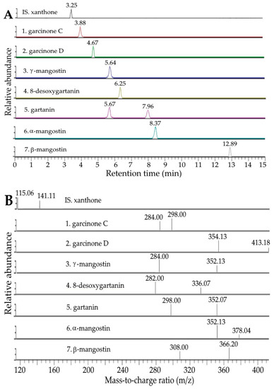 For quantitation, a concentration (10 μg/mL) of the internal standard xanthone was added to the xanthone extract, and pelargonidin-3-glucoside (10 μg/mL) to the anthocyanin extract. Following UPLC-MS/MS analysis, both xanthones and anthocyanins in mangosteen peels were quantified using the following formula: