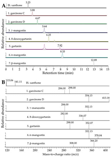 The UPLC-MS/MS chromatograms of various xanthone standards and internal standard (xanthone) as well as xanthone extracts containing the internal standard are shown in Figure 1 and Figure 2, respectively, while the UPLC-MS/MS chromatograms of anthocyanin standards and internal standard (pelargonidin 3-glucoside), as well as anthocyanin extracts containing the internal standard, are shown in Figure 3A and Figure 3B, respectively. Following the separation criteria as mentioned in the methods section, a total of seven xanthones including garcinone C, garcinone D, γ-mangostin, 8-desoxygartanin, gartanin, α-mangostin and β-mangostin were separated within 13 min, with the retention times being 3.88, 4.67, 5.64, 6.25, 7.96, 8.37, and 12.89 min, respectively (Table 1), while two anthocyanins, including cyanidin-3-sophoroside and cyanidin-3-glucoside, were separated within 8 min with the retention times being 7.25 and 7.67 min, respectively (Table 1). Through the comparison of mass-to-charge ratios (m/z) of both precursor ions and product ions of unknown peaks with standards and those reported in the literature [28,29,30], a total of seven xanthones and two anthocyanins in mangosteen peels were positively identified (Table 1).