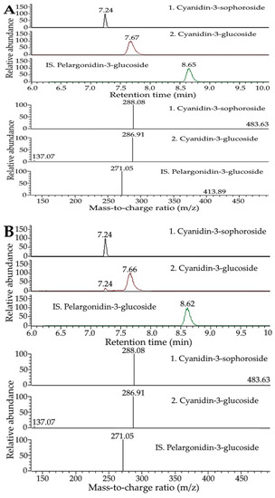 UPLC-MS/MS chromatograms of anthocyanin standards and internal standard perlargonidin-3-glucoside (A) and extract containing internal standard perlargonidin-3-glucoside (B) as detected by SRM mode.