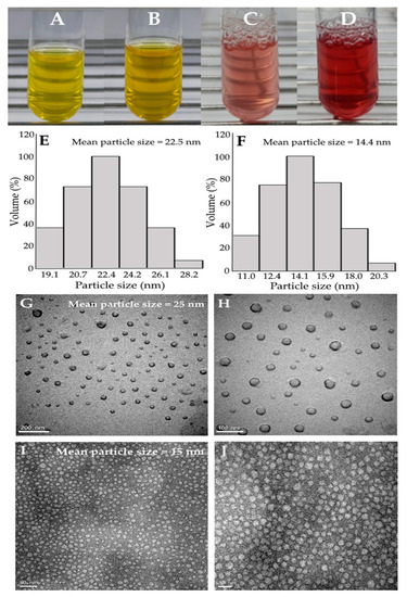 Appearance (A–D), particle size distribution (E,F) and TEM image (G–J) of xanthone nanoemulsion (A,B,E,G,H) and anthocyanin nanoemulsion (C,D,F,I,J). Xanthone nanoemulsion was prepared with a concentration of 4000 μg/mL (A) and 8000 μg/mL (B), while anthocyanin nanoemulsion was prepared with a concentration of 200 μg/mL (C) and 400 μg/mL (D).