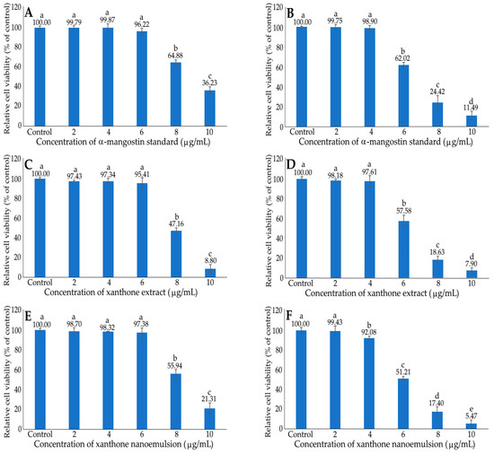 Effect of different concentrations of xanthone standard (A,B), extract (C,D) and nanoemulsion (E,F) on the growth of liver normal cells AML12 (A,C,E) and liver cancer cells HepG2 (B,D,F) after 48 h incubation, as measured by MTT assay. Data shown are mean ± standard deviation (n = 3) and data with different small letters (a–e) are significantly different at p < 0.05.