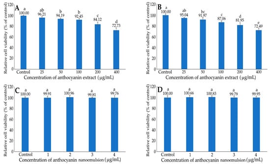 Effect of different concentrations of anthocyanin extract (A,B) and nanoemulsion (C,D) on the growth of liver normal cells AML12 (A,C) and liver cancer cells HepG2 (B,D) after 48 h incubation as measured by MTT assay. Data shown are mean ± standard deviation (n = 3) and data with different small letters (a–e) are significantly different at p < 0.05.
