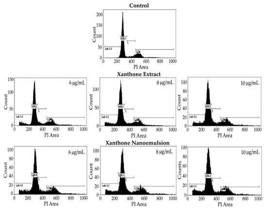 Human liver cancer cells HepG2 (1 × 106) were cultured in a 6-well plate and incubated for 24 h for cell attachment, after which the medium was sucked and added with three concentrations (6, 8 and 10 μg/mL) of xanthone extracts or nanoemulsions for triplicate experiments. After incubation for 48 h, the medium was collected in a centrifuge tube and trypsin-EDTA (0.5 mL) added for incubating (37 °C) for 5–10 min. Following cell floating, the reaction was terminated with medium (0.5 mL), followed by the collection of cytosols in a centrifuge tube for centrifuging at 1500 rpm (25 °C) for 3 min, removal of the supernatant, addition of PBS (300 μL), addition of 720 μL of ethanol slowly, and storage at −20 °C overnight to fix cells. Following thawing, the cytosols were centrifuged again at 1500 rpm (4 °C) for 5 min, followed by removal of the supernatant, addition of PBS (0.5 mL), and centrifuging again using the same condition. Then, PBS (0.8 mL) was added, followed by addition of RNase A and propidium iodide for reaction in the dark (37 °C) for 30 min. for the determination of the proportions of Sub-G1, G0/G1, S and G2/M phases using Kuluza analysis software (version 3.1, Beckman Coulter Inc., Taipei, Taiwan).