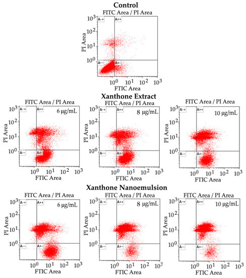 The apoptosis of liver cancer cell HepG2 as affected by different concentrations of xanthone extract and nanoemulsion is shown in Figure 9 and Table 6. Compared to the control treatment, a large decline in the proportion of viable cells was shown for both xanthone extract and nanoemulsion at 6, 8, and 10 μg/mL with a dose-dependent response. By comparison, the xanthone nanoemulsion was more effective than xanthone extract in decreasing the proportion of viable cells at the same dose. Conversely, all the proportions of early apoptosis, late apoptosis and necrosis cells rose substantially, especially for late apoptosis cells, following treatment with both xanthone extract and nanoemulsion at 2, 4 and 6 μg/mL. Specifically, a dose-dependent drop in the proportion of early apoptosis cells was found for both xanthone extract and nanoemulsion, with the proportion of the former being higher at the same dose. However, for the proportion of late apoptosis cells, a dose-dependent rise occurred for both xanthone extract and nanoemulsion, with the former proportion being lower at the same dose. This finding demonstrated that most HepG2 cells could undergo late apoptosis when treated with the xanthone nanoemulsion at 6, 8 and 10 μg/mL, while with the xanthone extract most HepG2 cells underwent early apoptosis at 6 and 8 μg/mL as well as late apoptosis at 10 μg/mL. Interestingly, the proportion of necrosis cells showed inconsistent change for the xanthone extract, but for the xanthone nanoemulsion a dose-dependent decline was found, with the former proportion being higher at 8 and 10 μg/mL. Comparatively, the xanthone extract was more effective than the xanthone nanoemulsion in inducing HepG2 cells to undergo necrosis. Nevertheless, a large proportion of HepG2 cells underwent late apoptosis following treatment with the xanthone nanoemulsion, probably caused by the EPR effect, as mentioned above. The result observed in this study is similar to a report by Jin et al. [44], who prepared the xanthone extract from the bark of Garcinia xanthochymus with 95% ethanol; a dose-dependent increment in the proportion of apoptotic cells was shown, with the proportion of late apoptosis cells being higher than early apoptosis cells. Similar findings were reported by Abu Bakar et al. [45] and Zhang et al. [40], with the former using xanthone extract prepared from Garcinia dulcis fruit for the treatment of HepG2 cells for 72 h, and the latter using α-mangostin standard for the treatment of HepG2 and SK-Hep-1 for 24 h; a large rise in the proportion of late apoptosis cells was found when compared to the proportions of early apoptosis cells and necrosis cells.