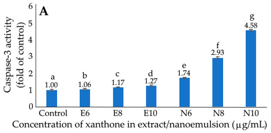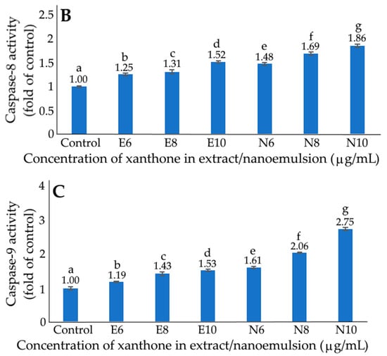 Figure 10 shows the effects of xanthone extract and nanoemulsion on caspase-3 (A), caspase-8 (B) and caspase-9 (C) activities of liver cancer cells HepG2. Compared to the control treatment, both xanthone extract and nanoemulsion showed a significantly higher caspase-3 activity (p < 0.05) at 6, 8 and 10 μg/mL. Additionally, a dose-dependent increment in caspase-3 activity was found for both xanthone extract and nanoemulsion treatments, with the latter showing a higher activity at the same dose. The same tendency was observed for both caspase-8 and caspase-9 activities, as evident by a dose-dependent rise for both xanthone extract and nanoemulsion, as well as a higher activity for xanthone nanoemulsion when compared at the same dose. Collectively, during apoptosis, caspase-8 can be activated through the death receptor pathway (external route) while caspase-9 can be activated through the mitochondrial pathway (internal route) for the subsequent activation of caspase-3 and the execution of apoptosis.